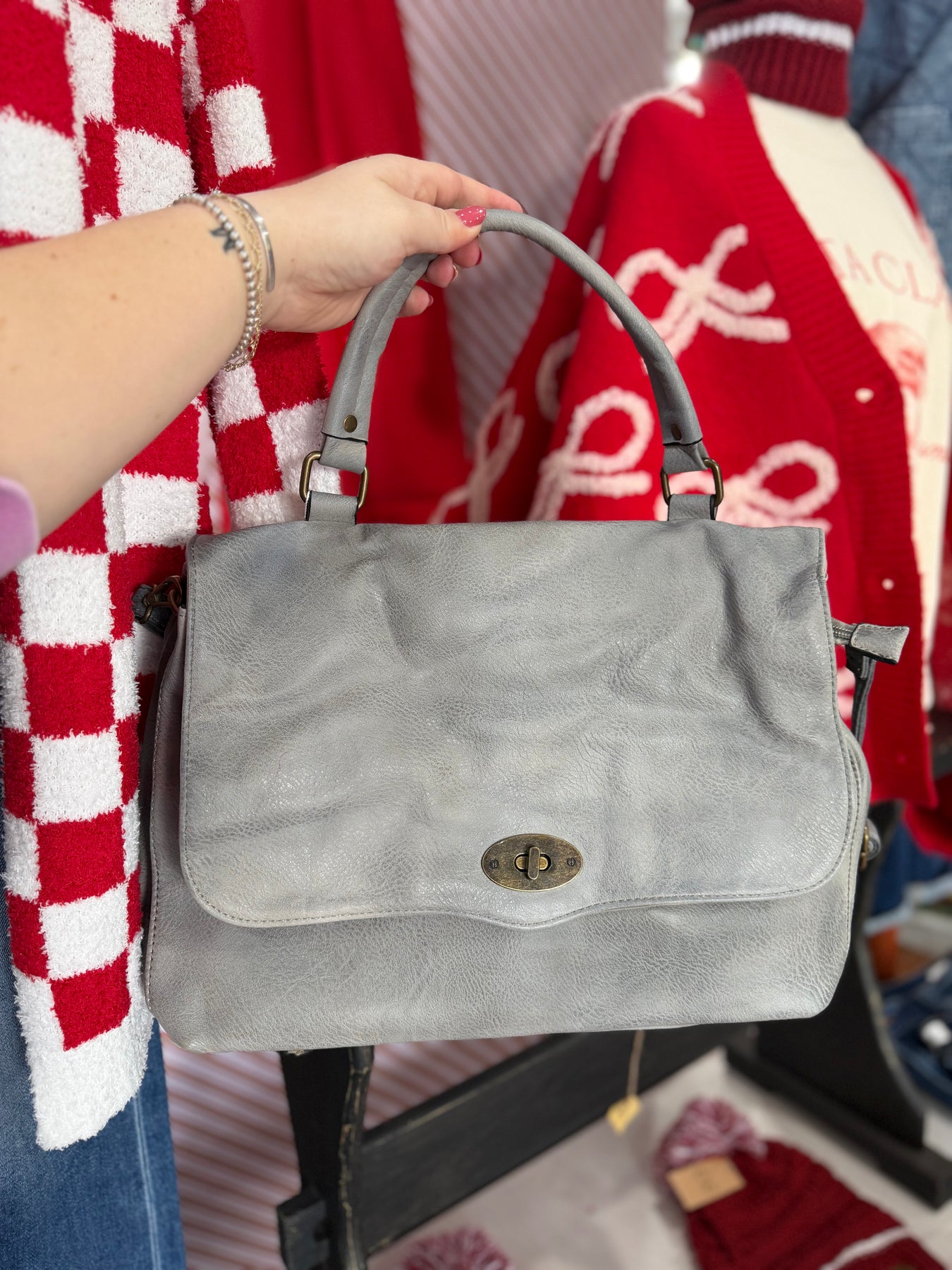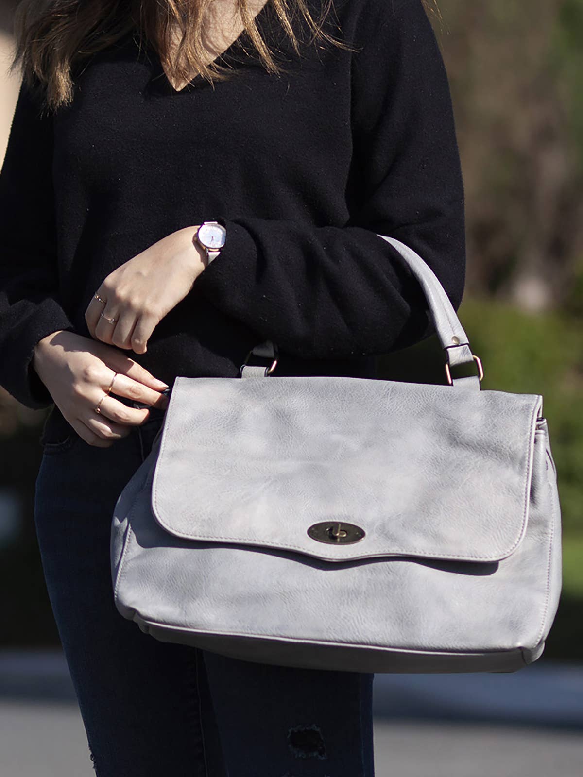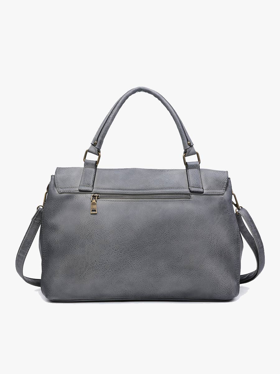Item Details: -Style: Harley Rustic Satchel with Flapover and Twist Lock Closure -Material: Vegan leather with antique brass hardware -Closure: Flapover with twist lock -Handles/Straps: Top handle; adjustable and detachable shoulder strap -Pockets/Compartments: Three compartments (one zippered), slip and zip pockets, back zip pocket Dimensions: -Length: 15 inches -Height: 10 inches -Depth: 5 inches The M1847 Harley Rustic Satchel is a versatile women’s satchel bag made from durable vegan leather with antique brass hardware. Featuring a twist lock flapover closure, multiple compartments, and various pockets, it keeps your essentials organized while offering both handheld and crossbody carrying options. Perfect for everyday use or work, this rustic satchel blends classic style with functional design.