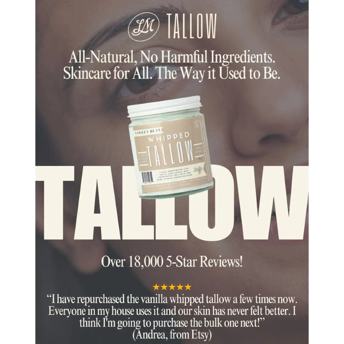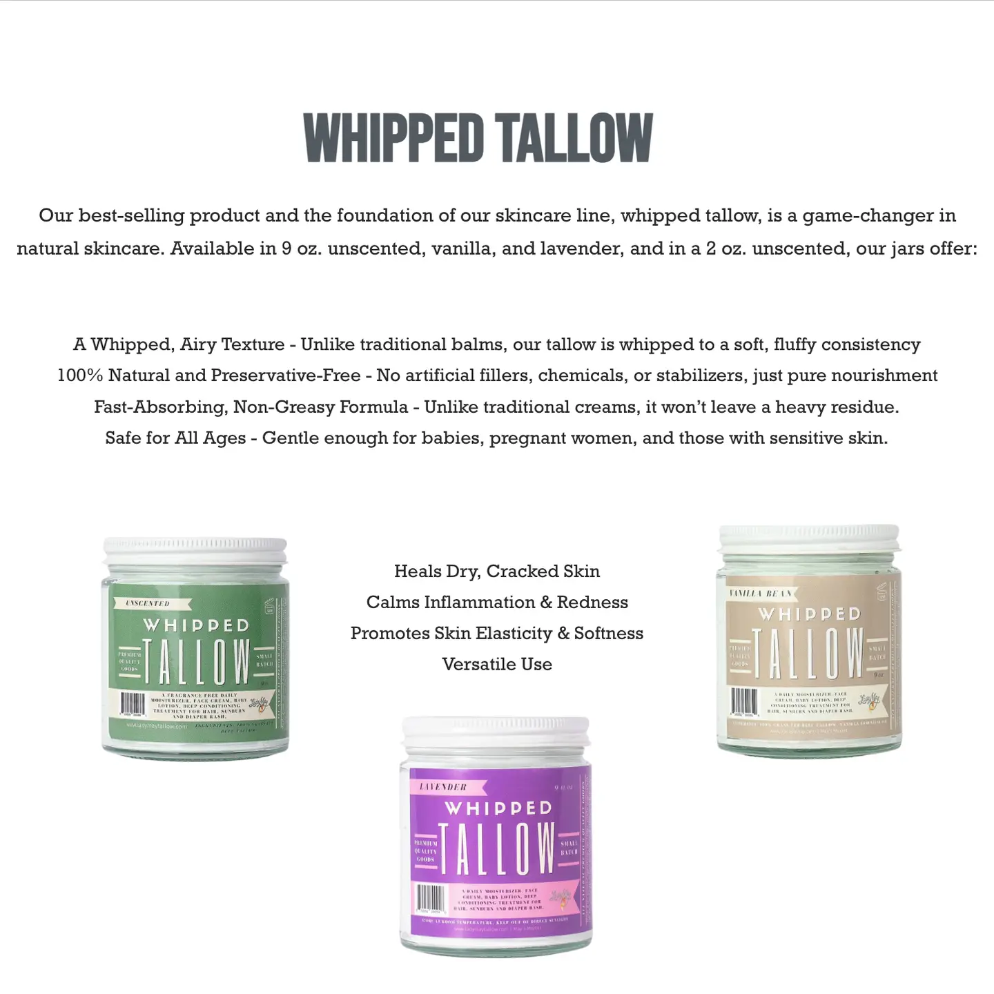 Description: Whipped Tallow is a simple, effective way to moisturize your skin with no fillers, preservatives, or seed oils. It's made with pure beef tallow, whipped into a soft, fluffy texture that melts on contact and absorbs quickly. Use it daily on your face, hands, feet, or anywhere your skin needs deep, lasting hydration. Suitable for all ages and all skin types. Why It Works ✔️ Rich in vitamins A, D, E, and K ✔️ Whipped texture for easy application ✔️ No preservatives, parabens, or seed oils ✔️ Gentle enough for babies and sensitive skin ✔️ Only one to two ingredients per variant Scent Options Unscented, Vanilla, Lavender, Eucalyptus.