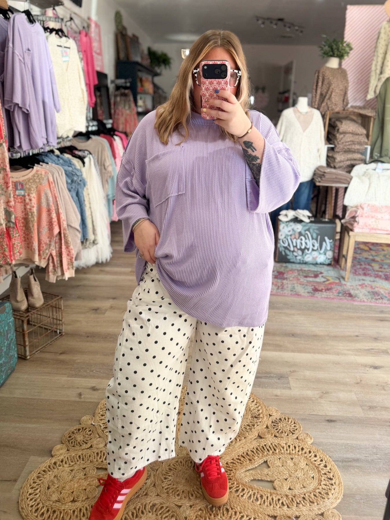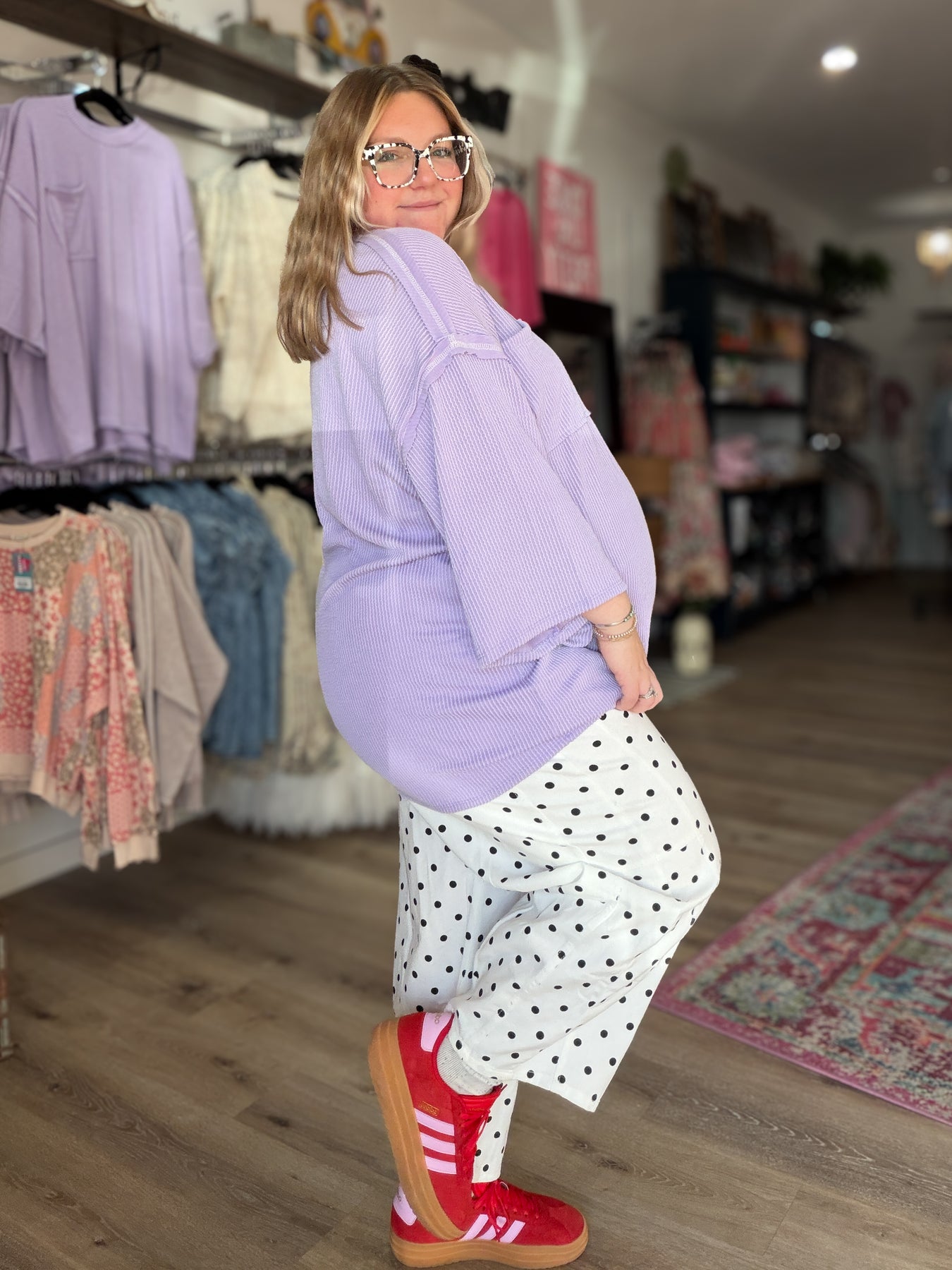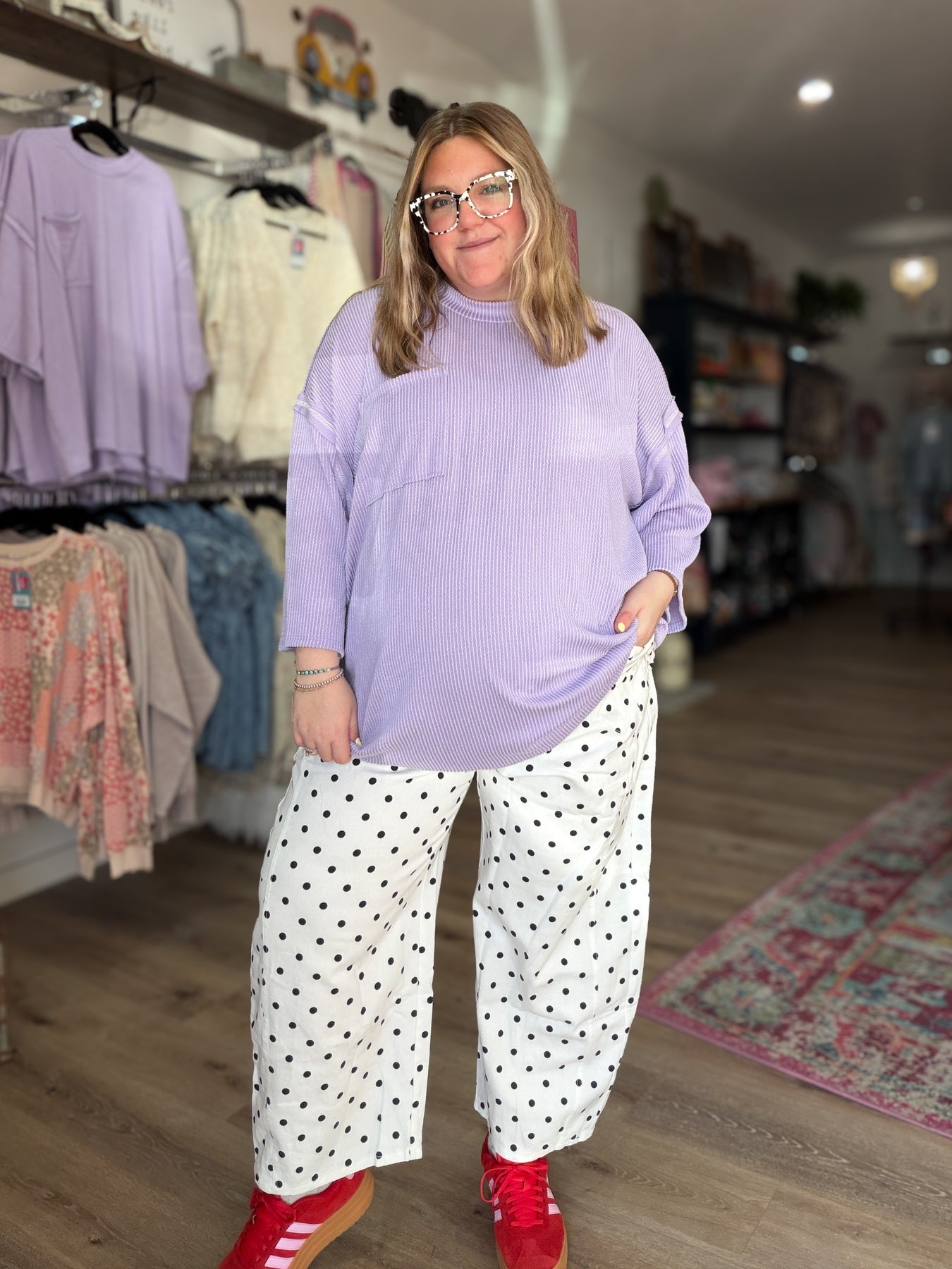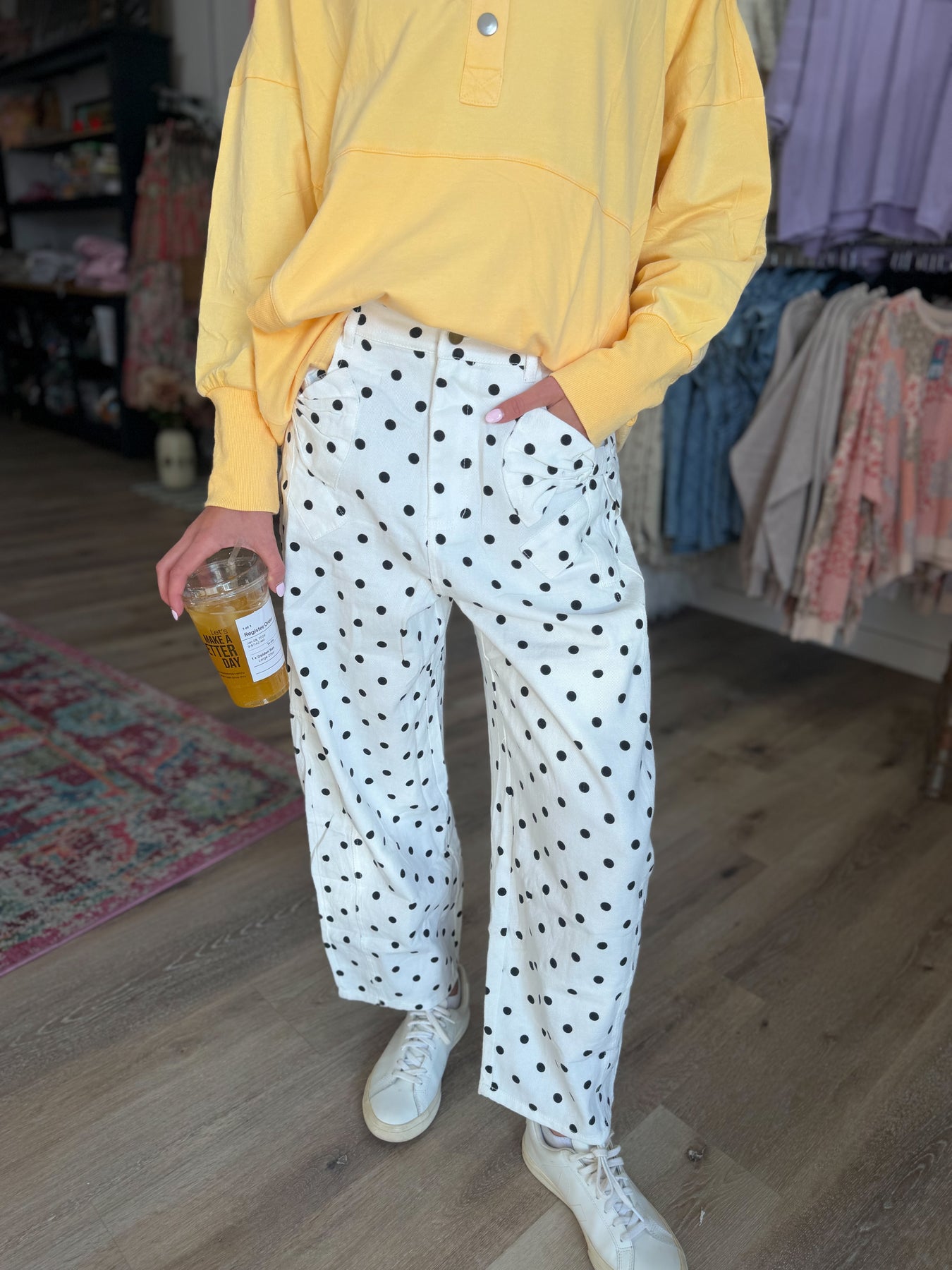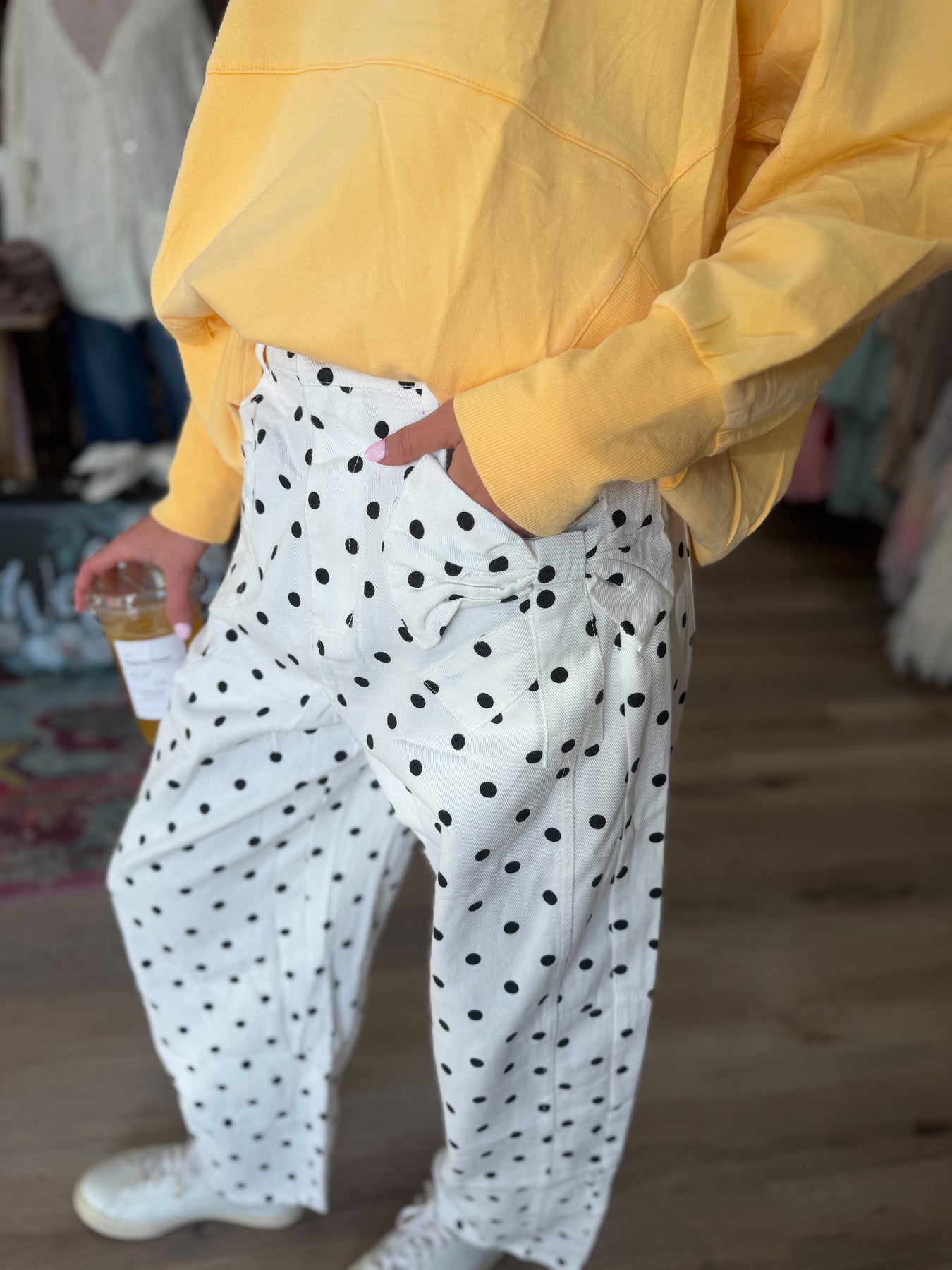 These lightweight denim pants are so cute! The denim is thin and breathable, it is not rigid at all. It has an elastic waistband on the back with a button and zipper up front. They fit a little oversized but we recommend getting your true size for best fit!