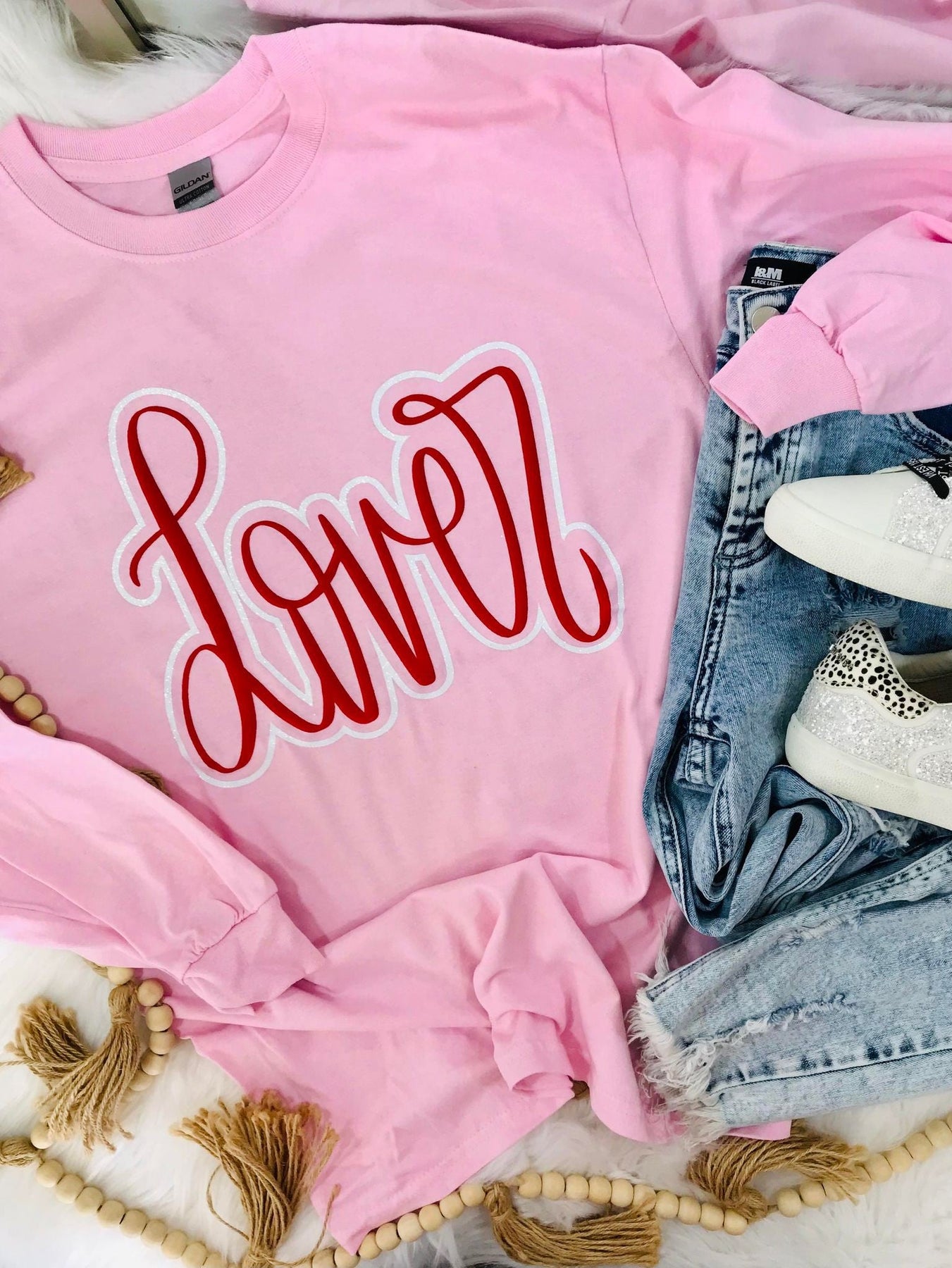**PLEASE READ BEFORE PURCHASING**Brand: GildanColor Pictured: Light PinkDescription: Red puff & White glitter vinylThese tees are printed with VINYL, not screen-print or sublimation!*Screen Resolution may alter shirt color/design brightness*