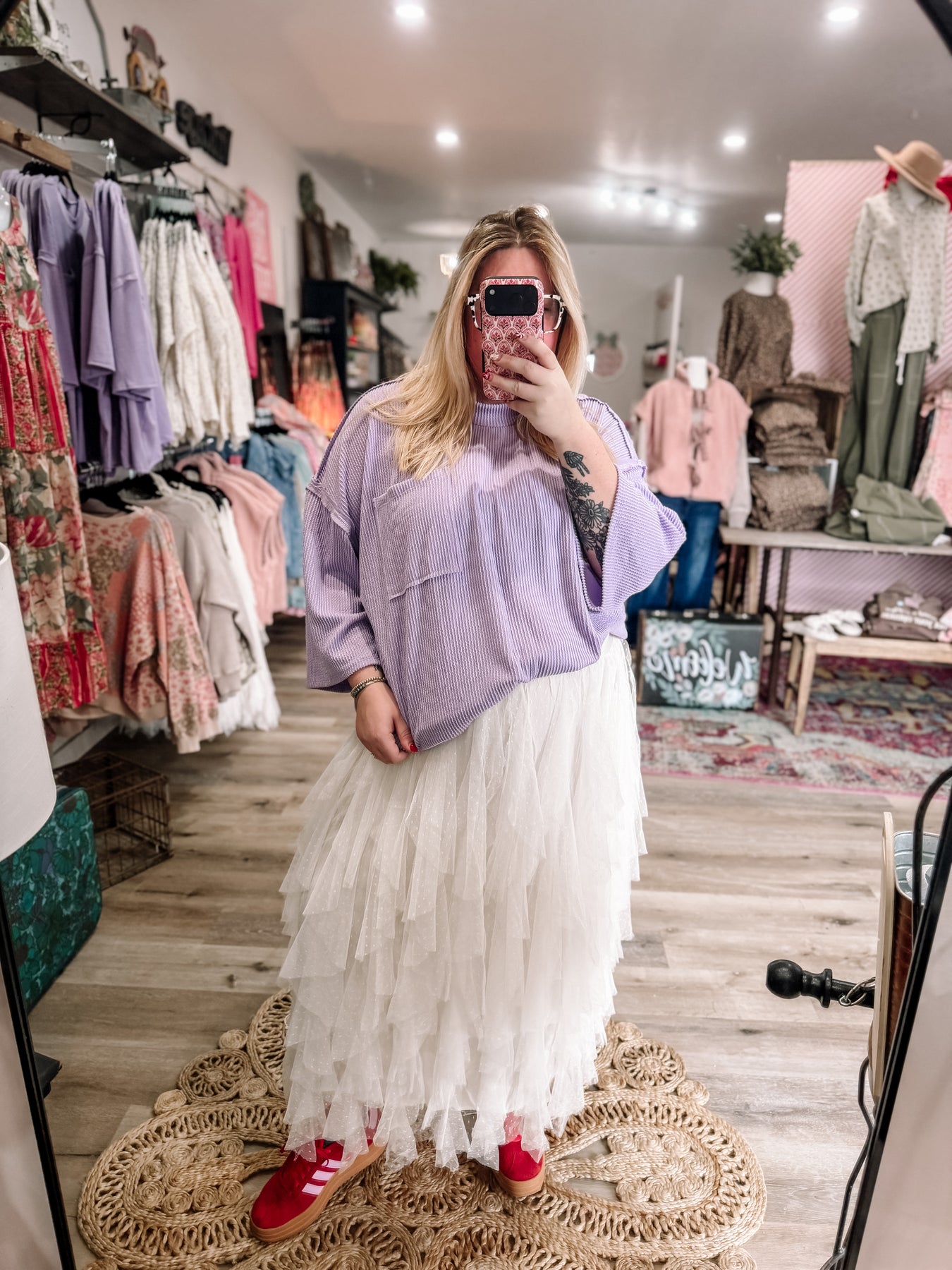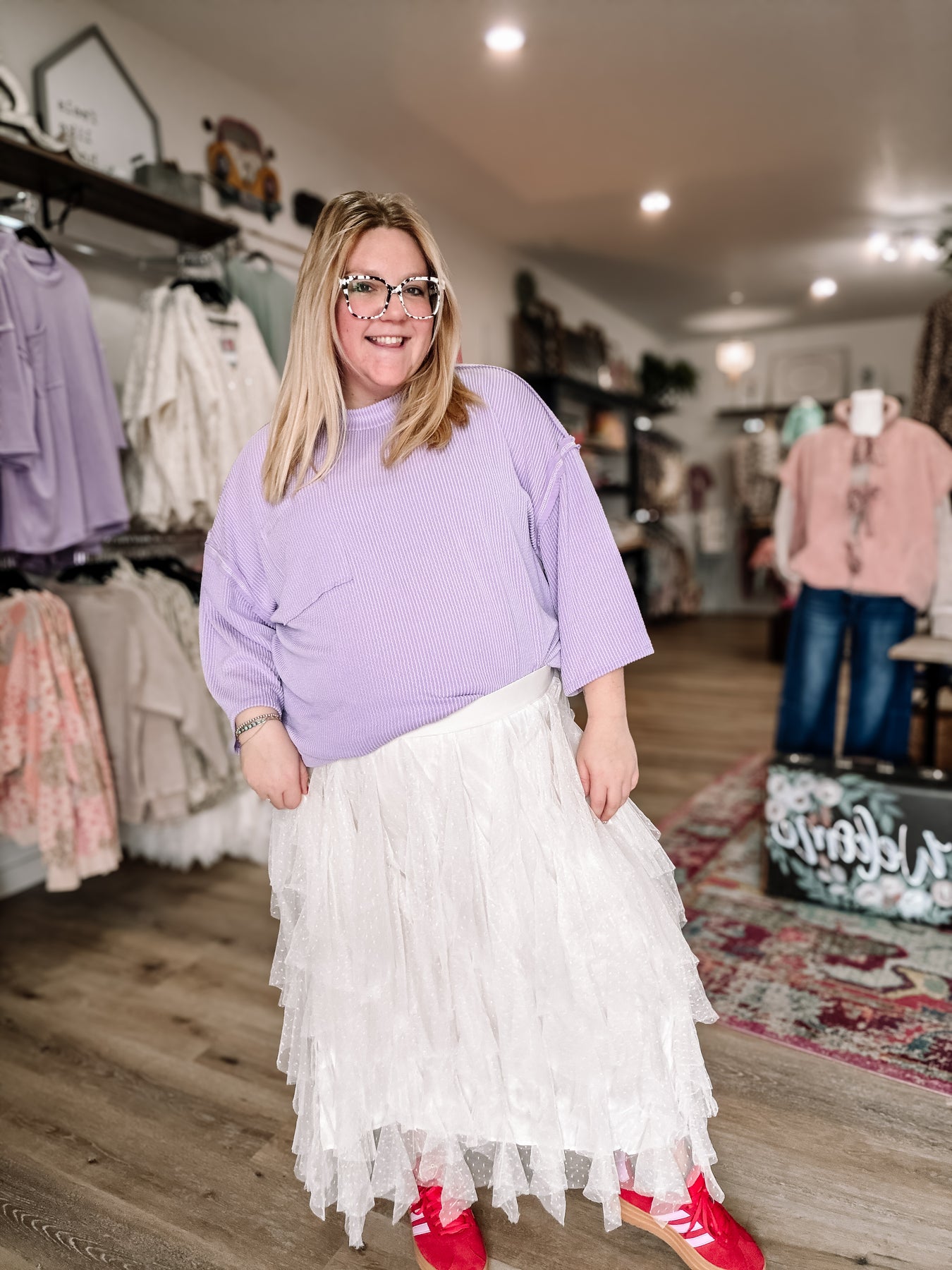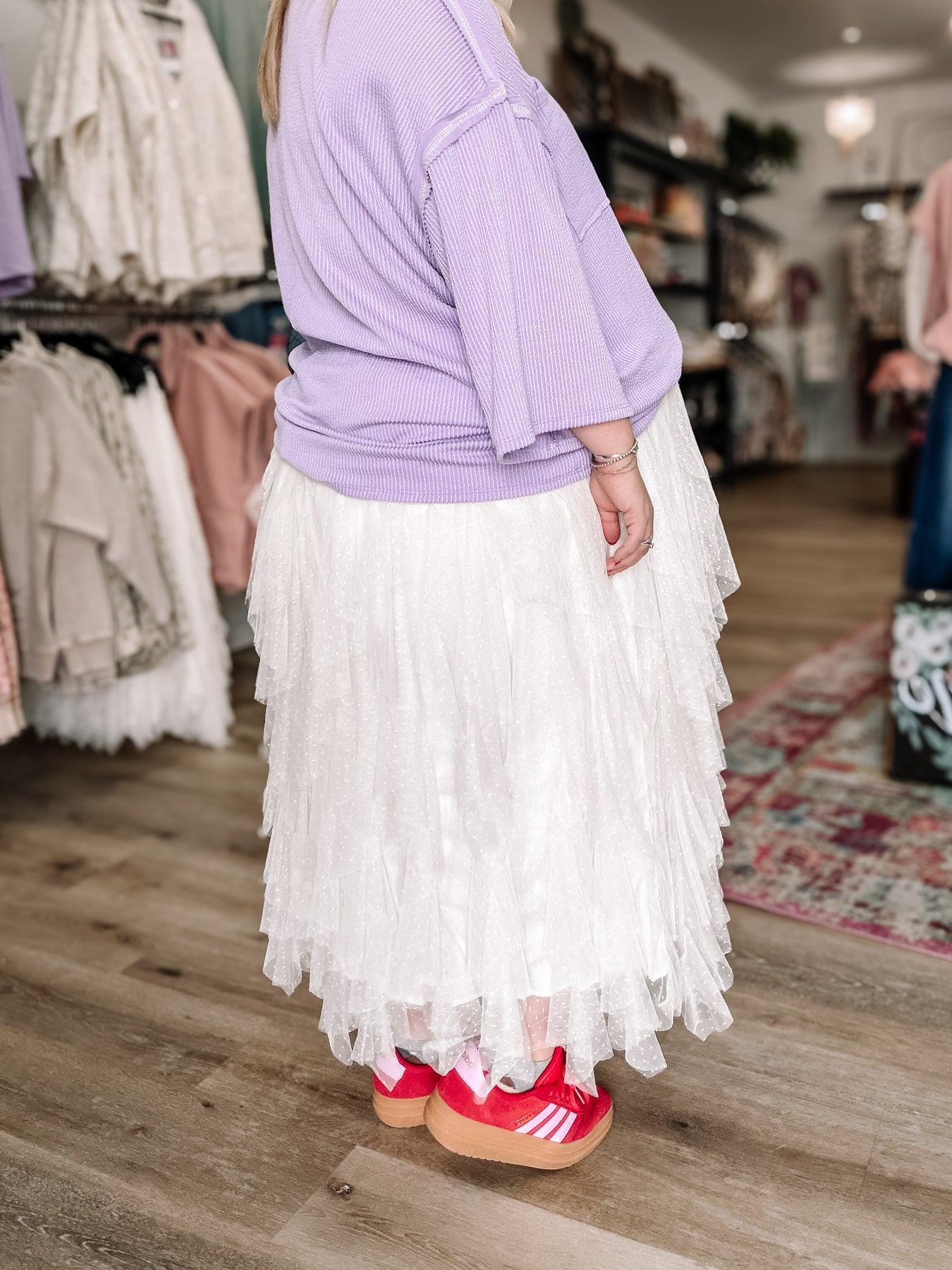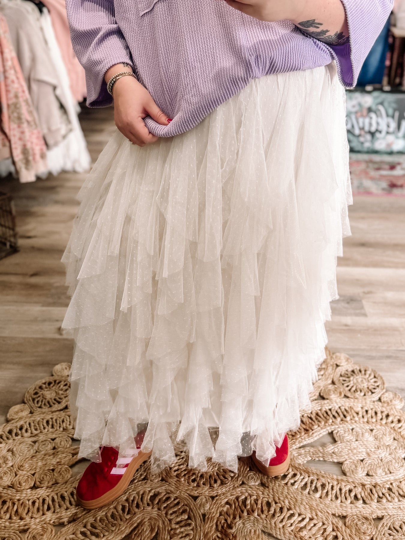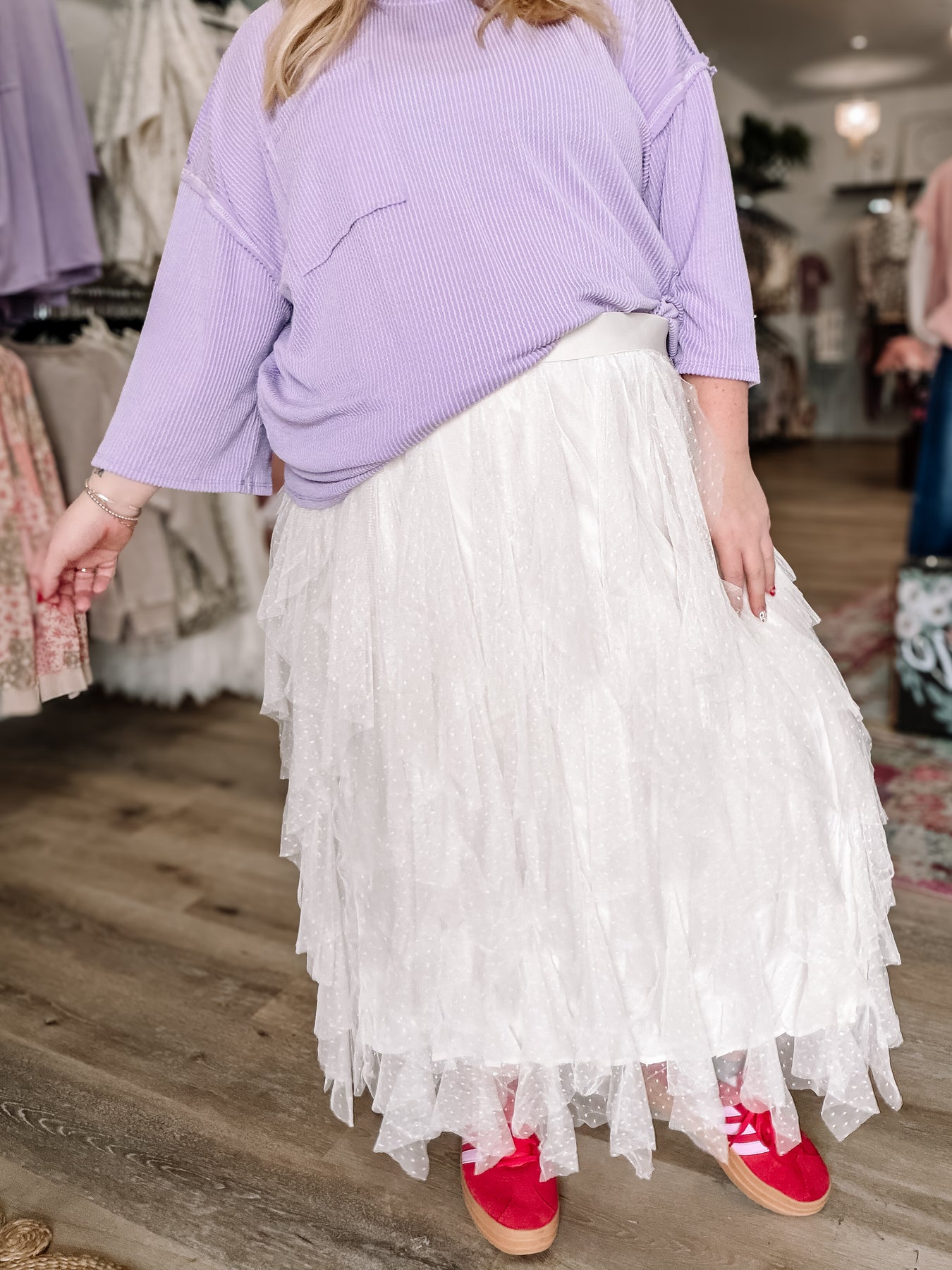 Adorable, lightweight tulle skirt! Has cute little polka dots too. Fits true to size but has a stretchy waistband so you can size down if you want. Kendall is in a 3xl.