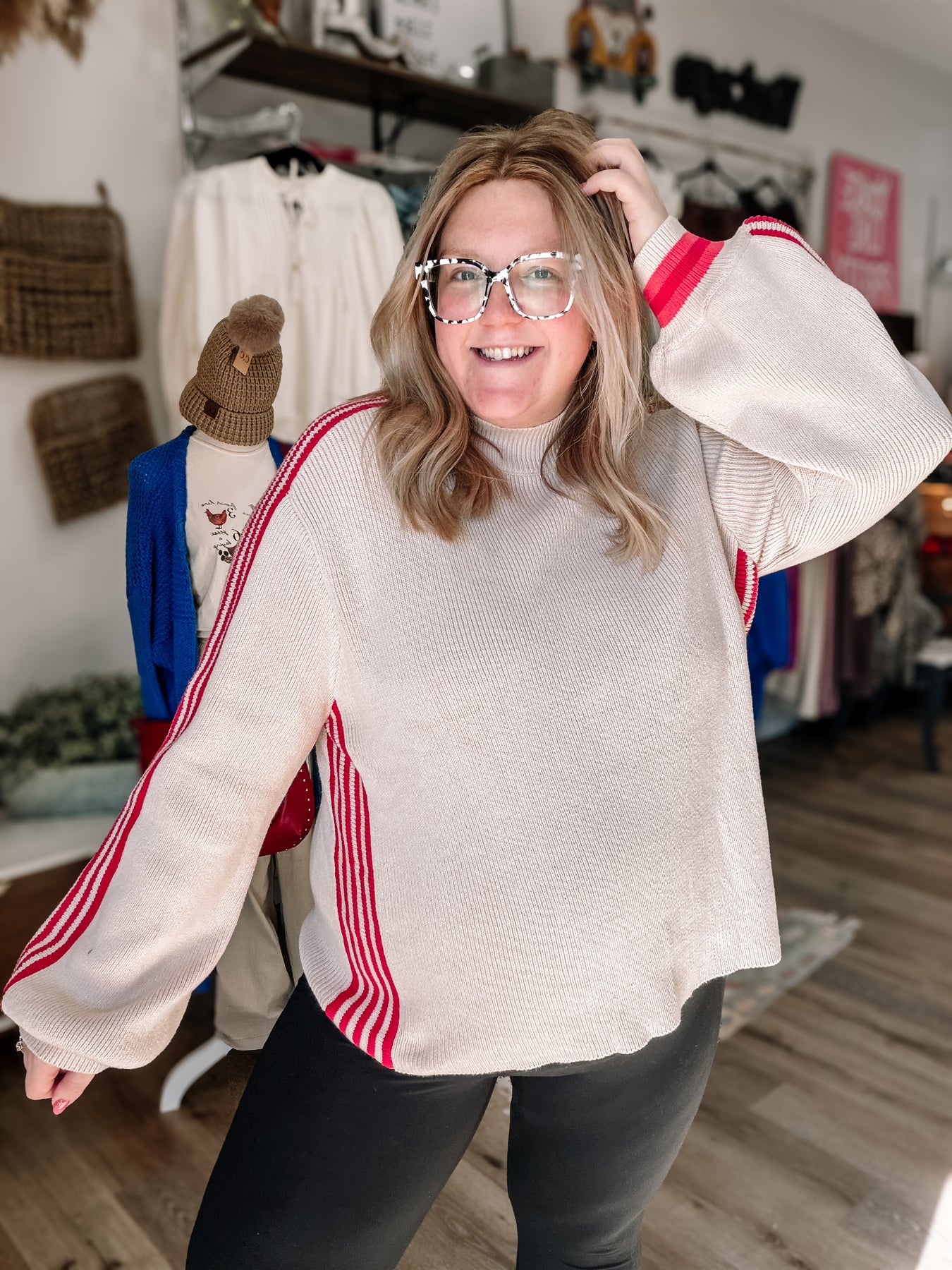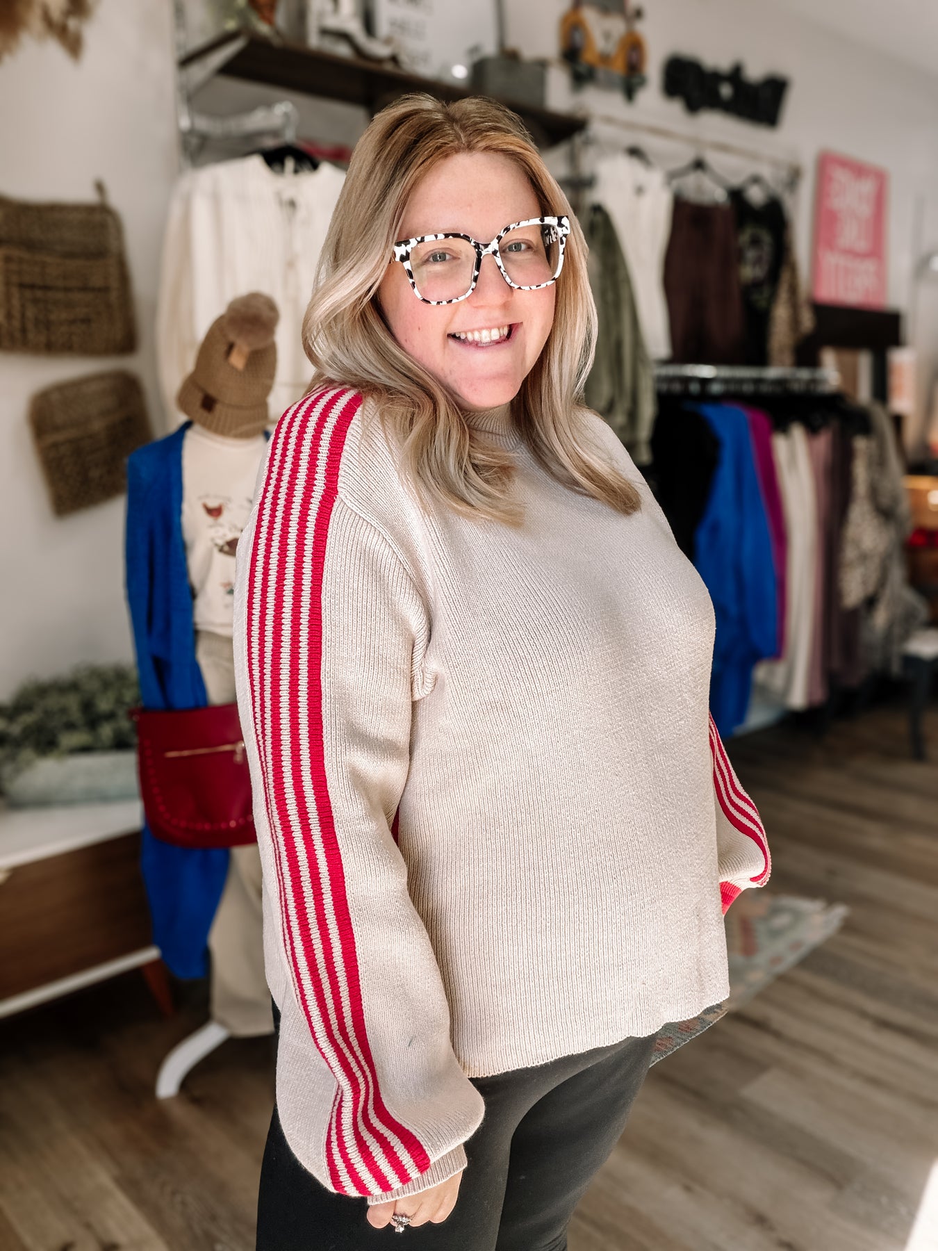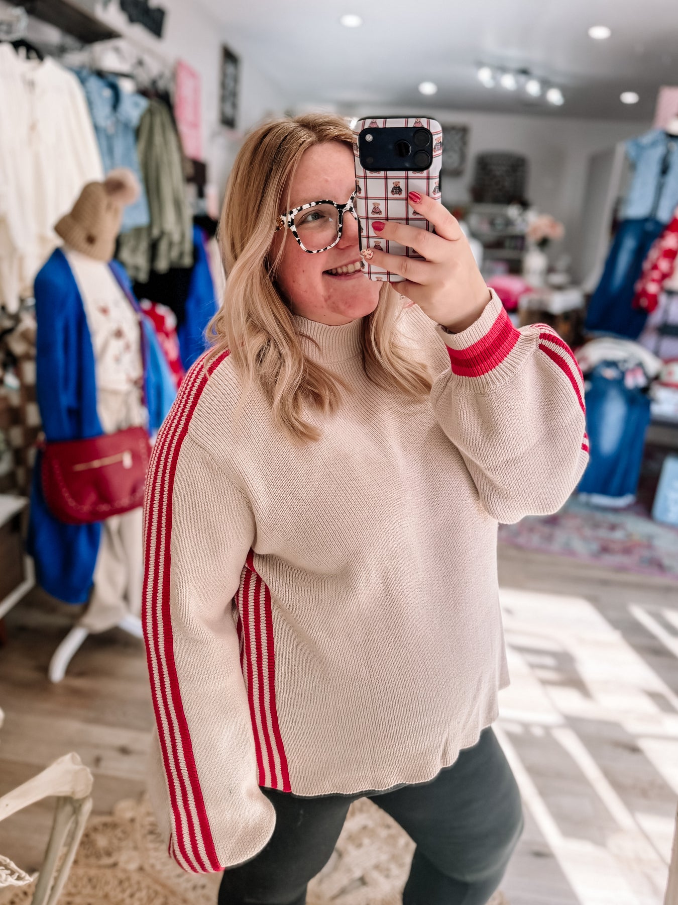 Super cute and nice quality sweater! Featured adorable red striped down the sleeves, side and around the wrists. Kendall is in her true size 2xl. Definitely fits true to size so if you want the oversized look, size up.
