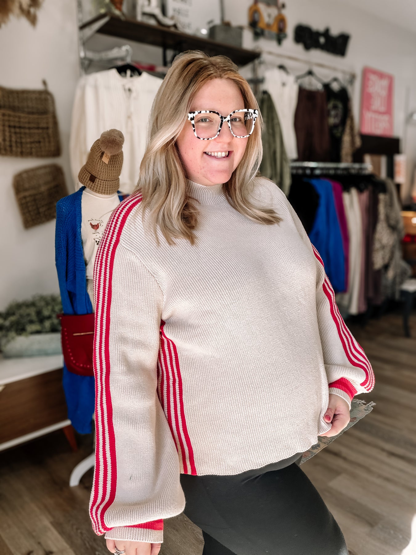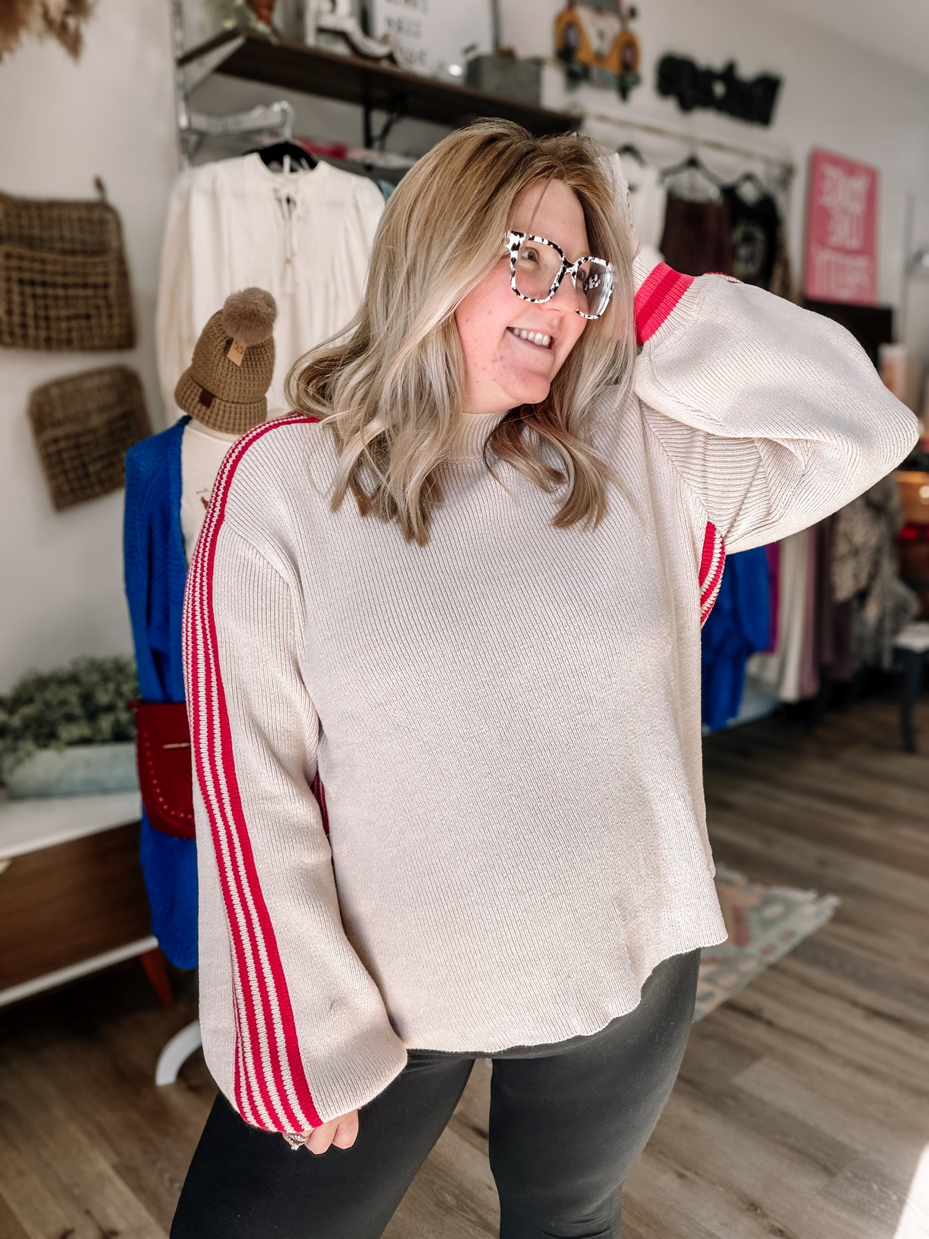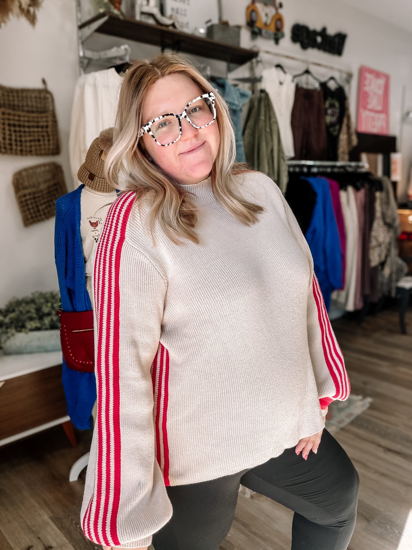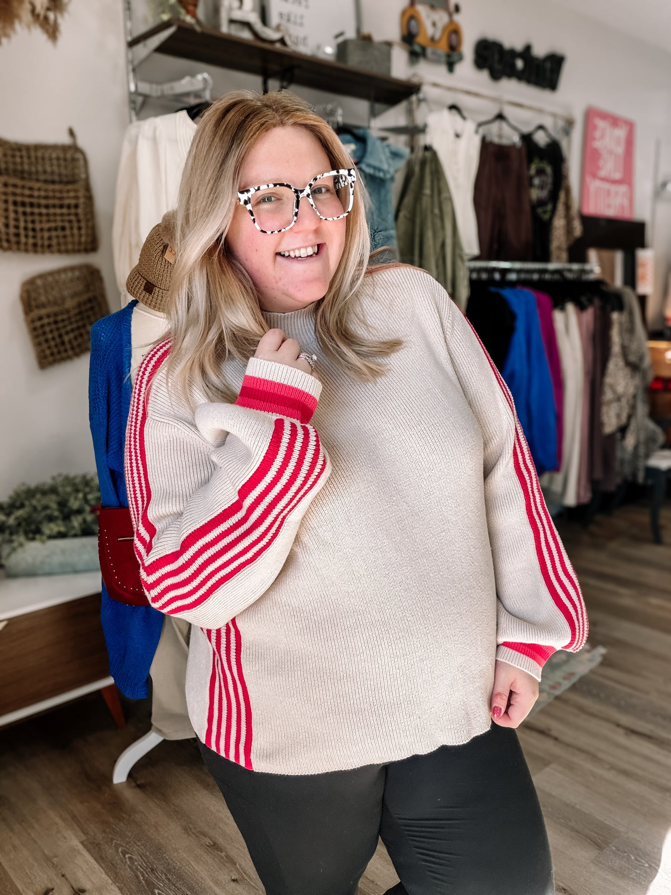 Super cute and nice quality sweater! Featured adorable red striped down the sleeves, side and around the wrists. Kendall is in her true size 2xl. Definitely fits true to size so if you want the oversized look, size up.