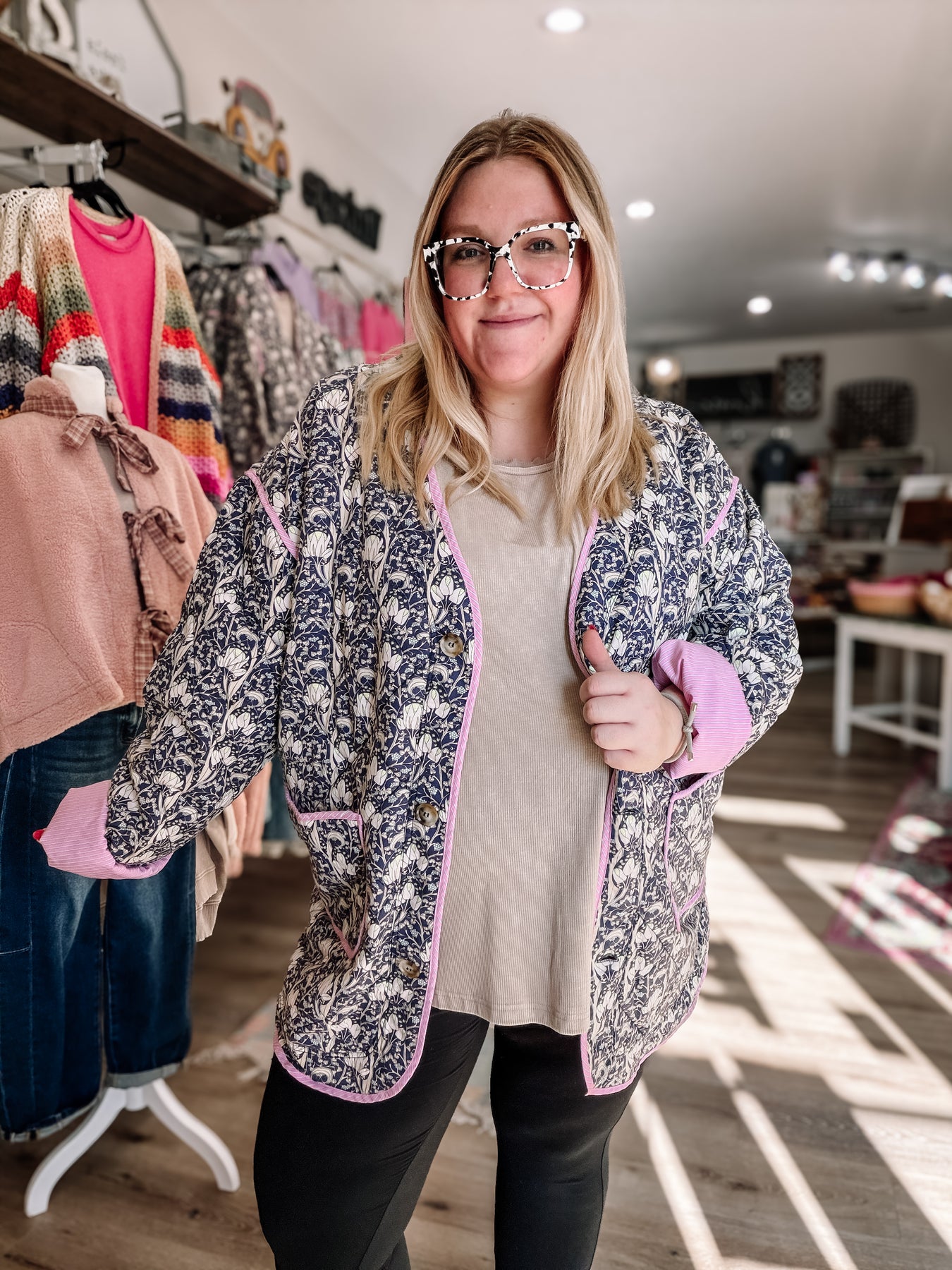 Lightweight, quilted jacket. Runs a tad oversized. Kendall is in a 2xl, her true size. It has functional buttons and pockets.