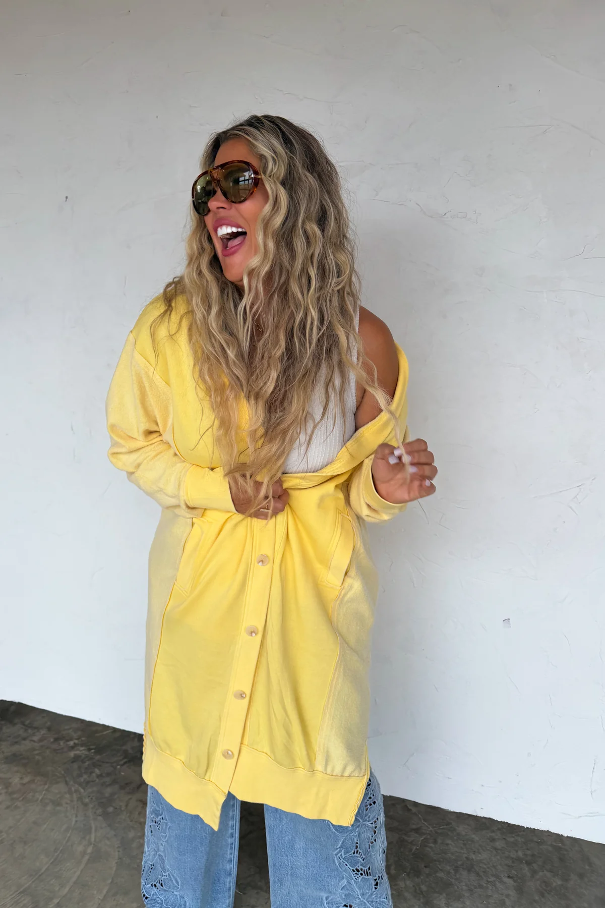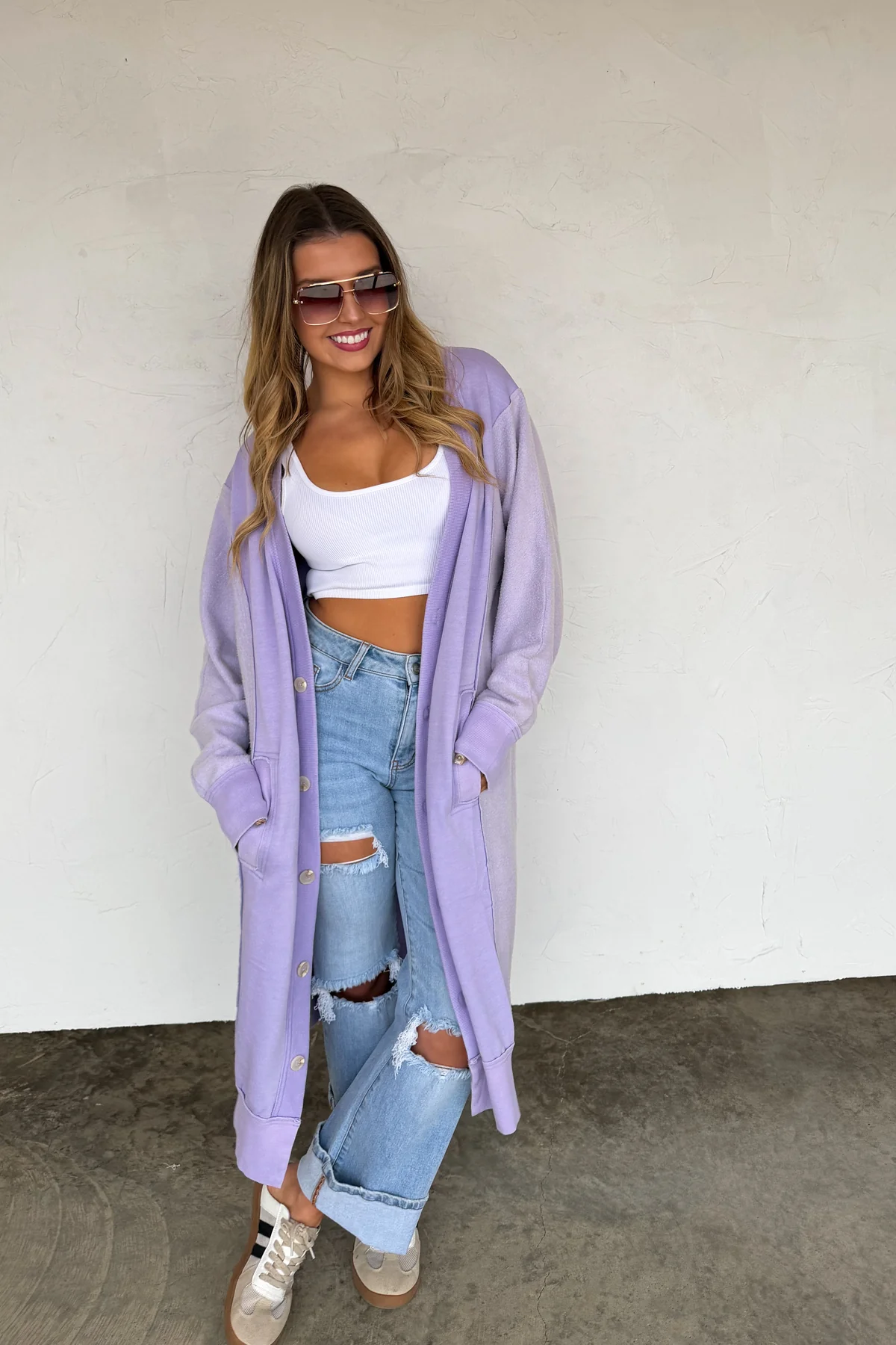 Made with luxurious DETAILING, this long cardigan features functional buttons, reverse fabric details on the sides, and pockets. Perfect for those chilly days, the luxury cardi adds style and practicality to your wardrobe.