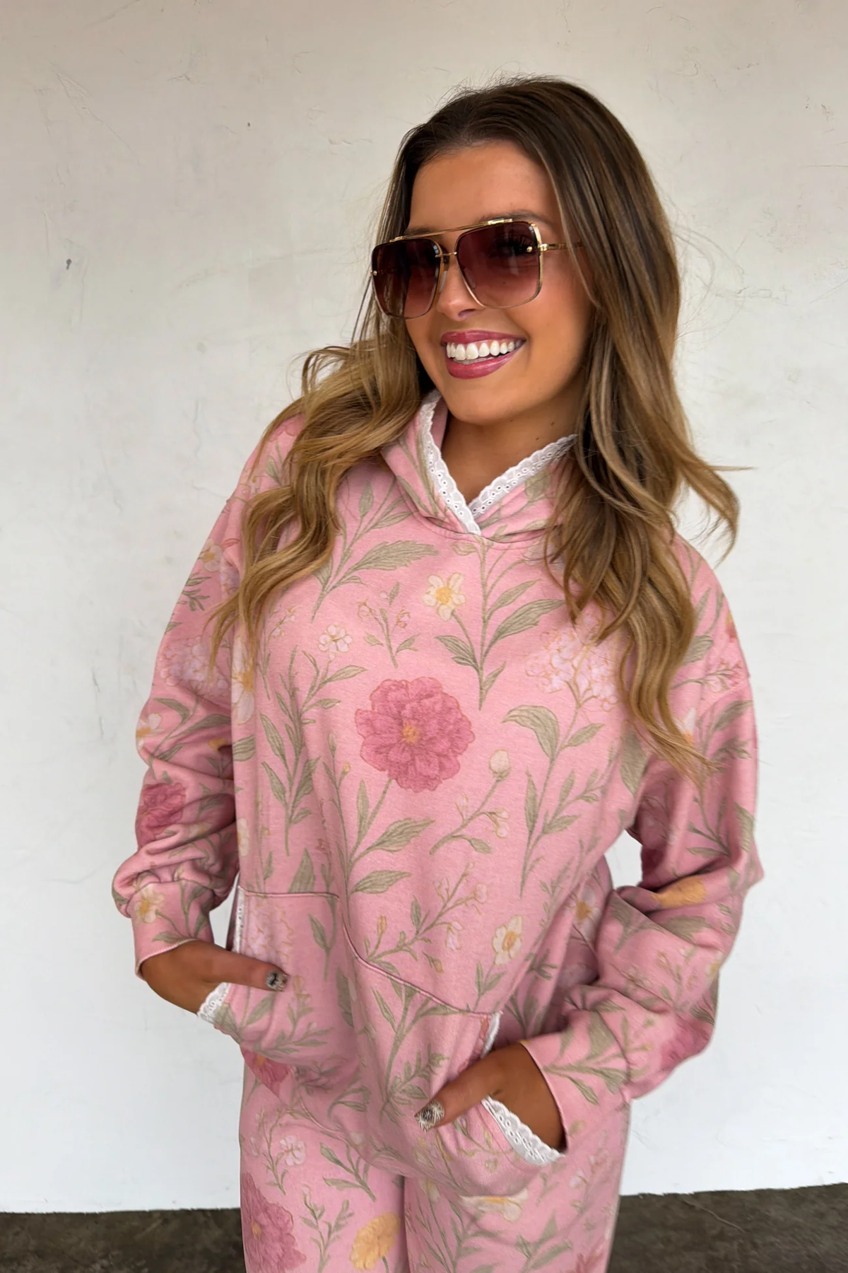 A soft floral hoodie featuring delicate lace trim accents for a feminine twist on a casual classic. Designed with a relaxed fit, front pocket, and cozy feel—perfect for lounging, layering, or effortless everyday wear. Perfectly matches our Rose Joggers.