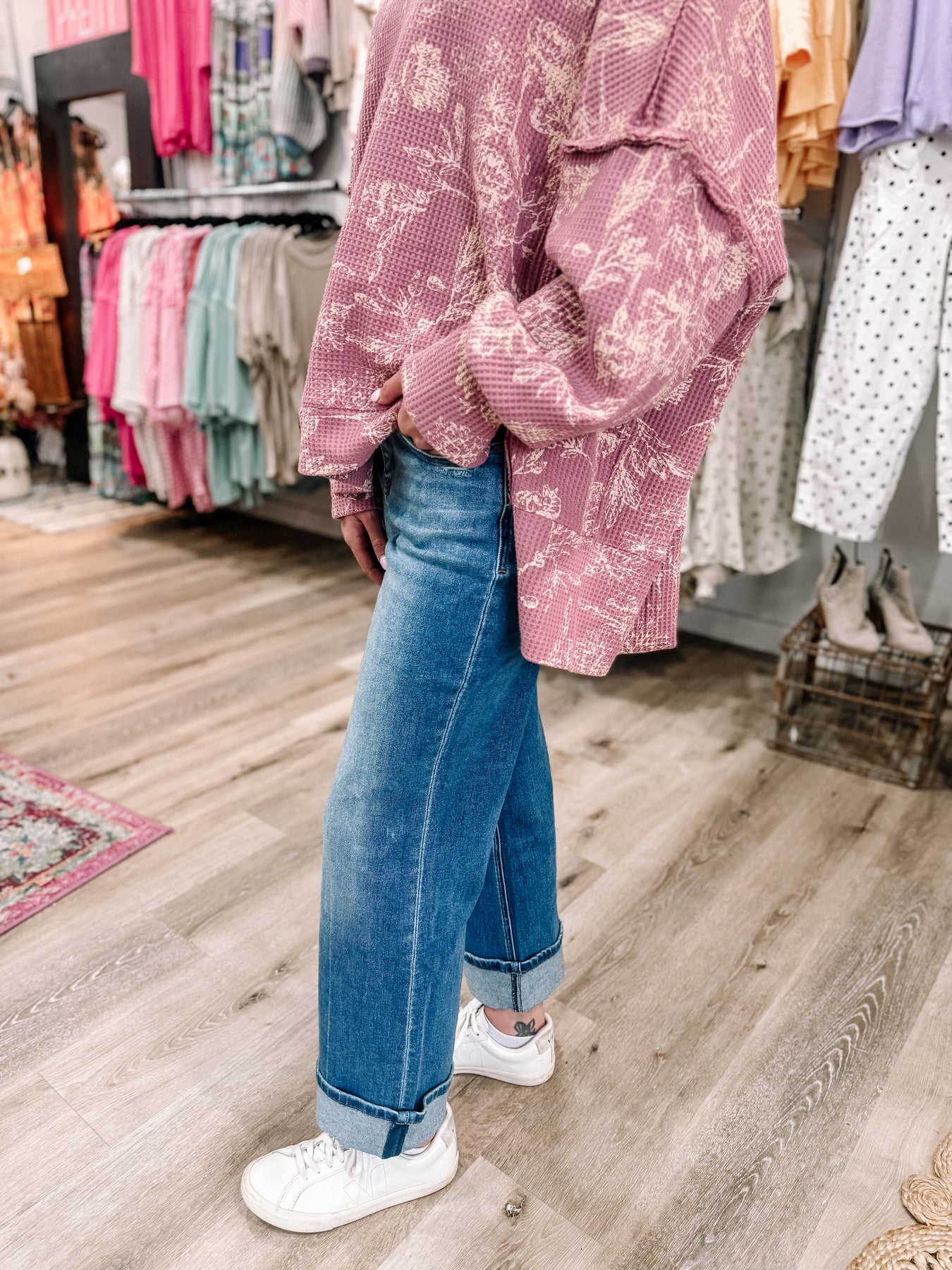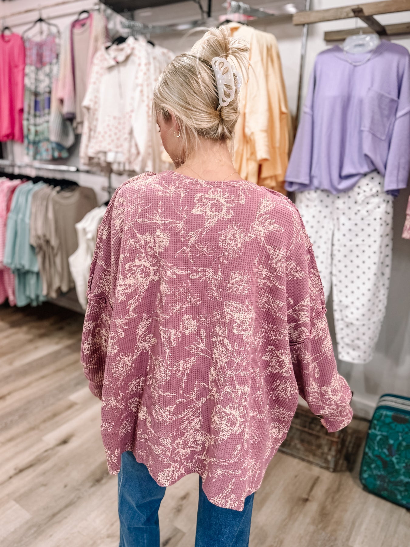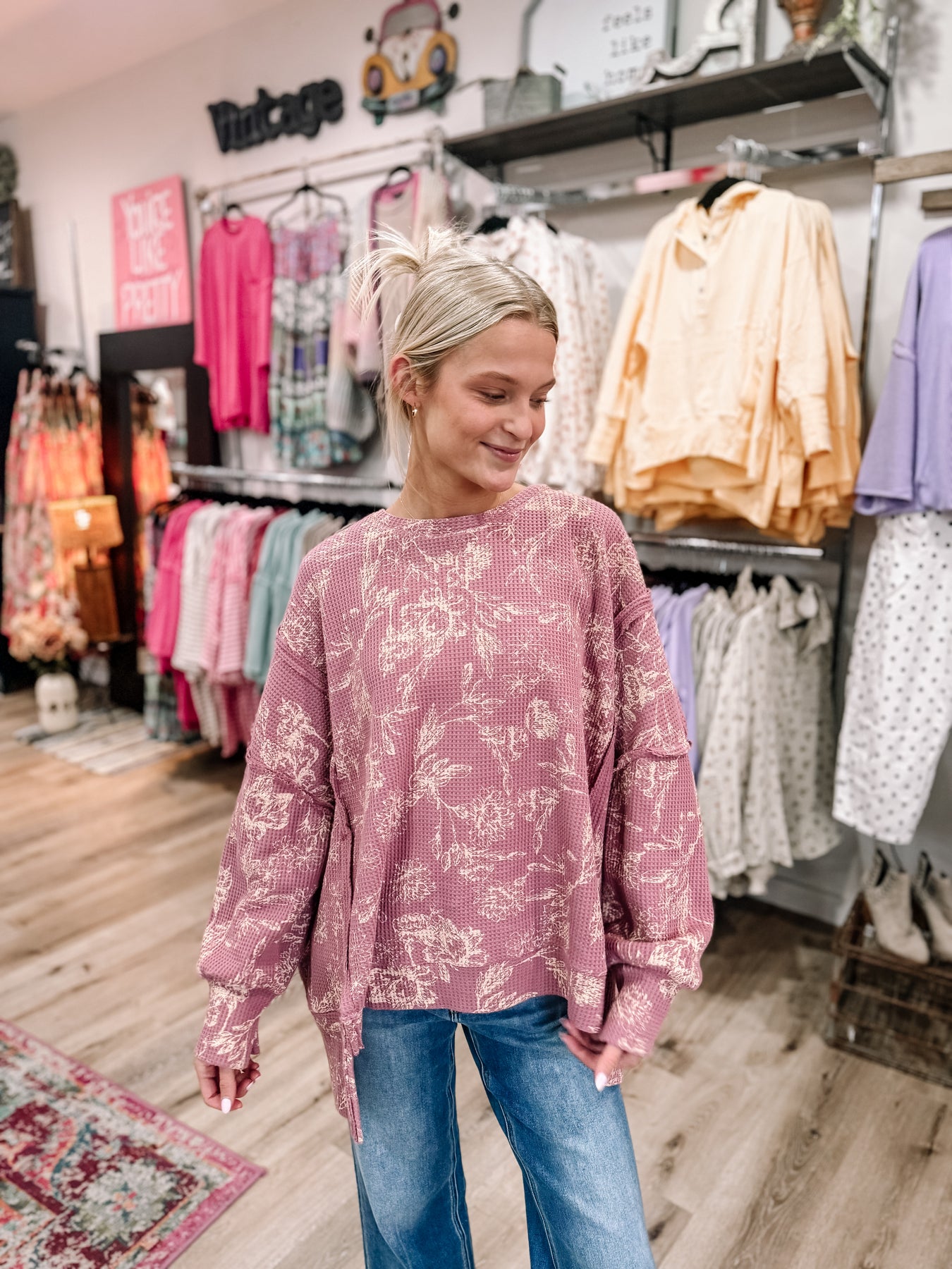 Oversized, comfortable thicker waffle knit top. Brand is Bibi, runs oversized. Alyvia is in the small. The XL will fit up to 3xl.