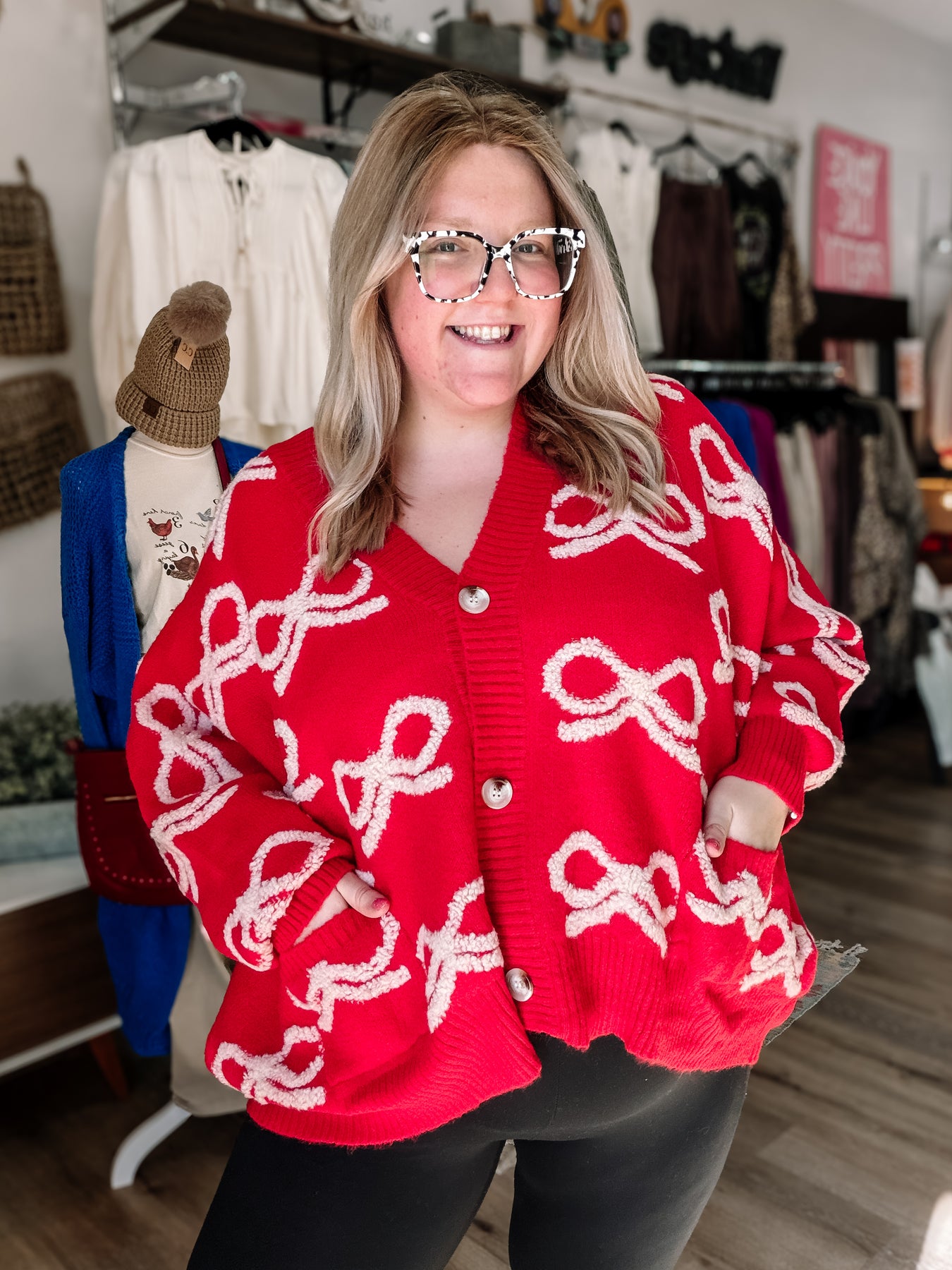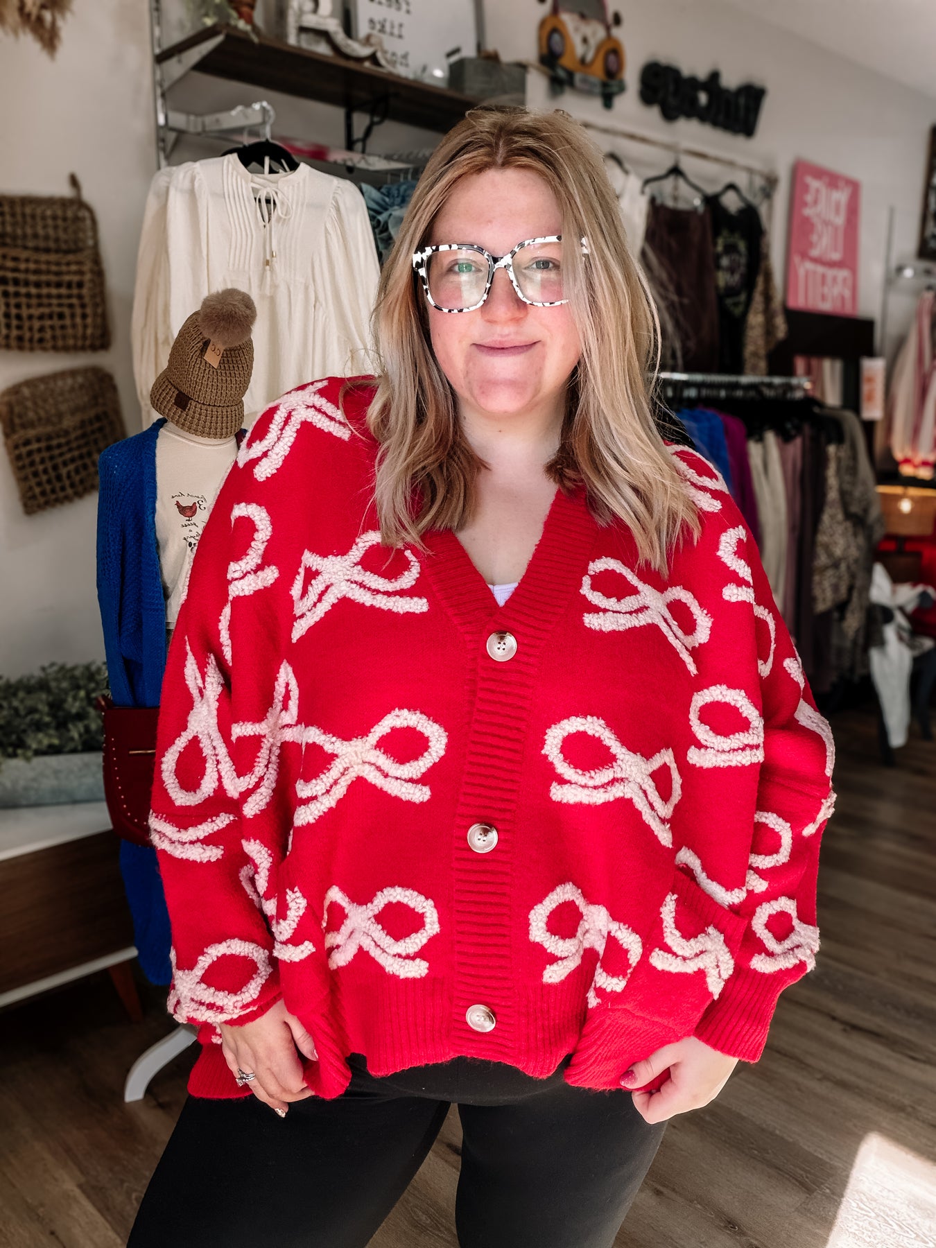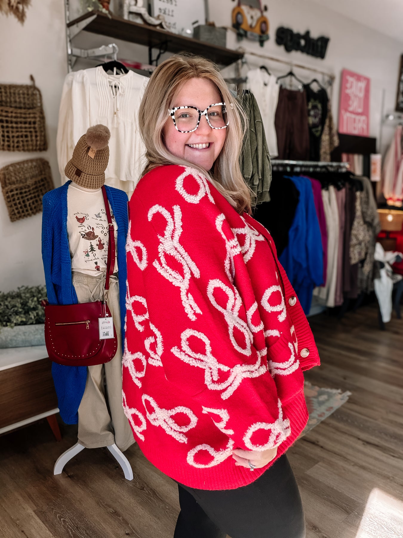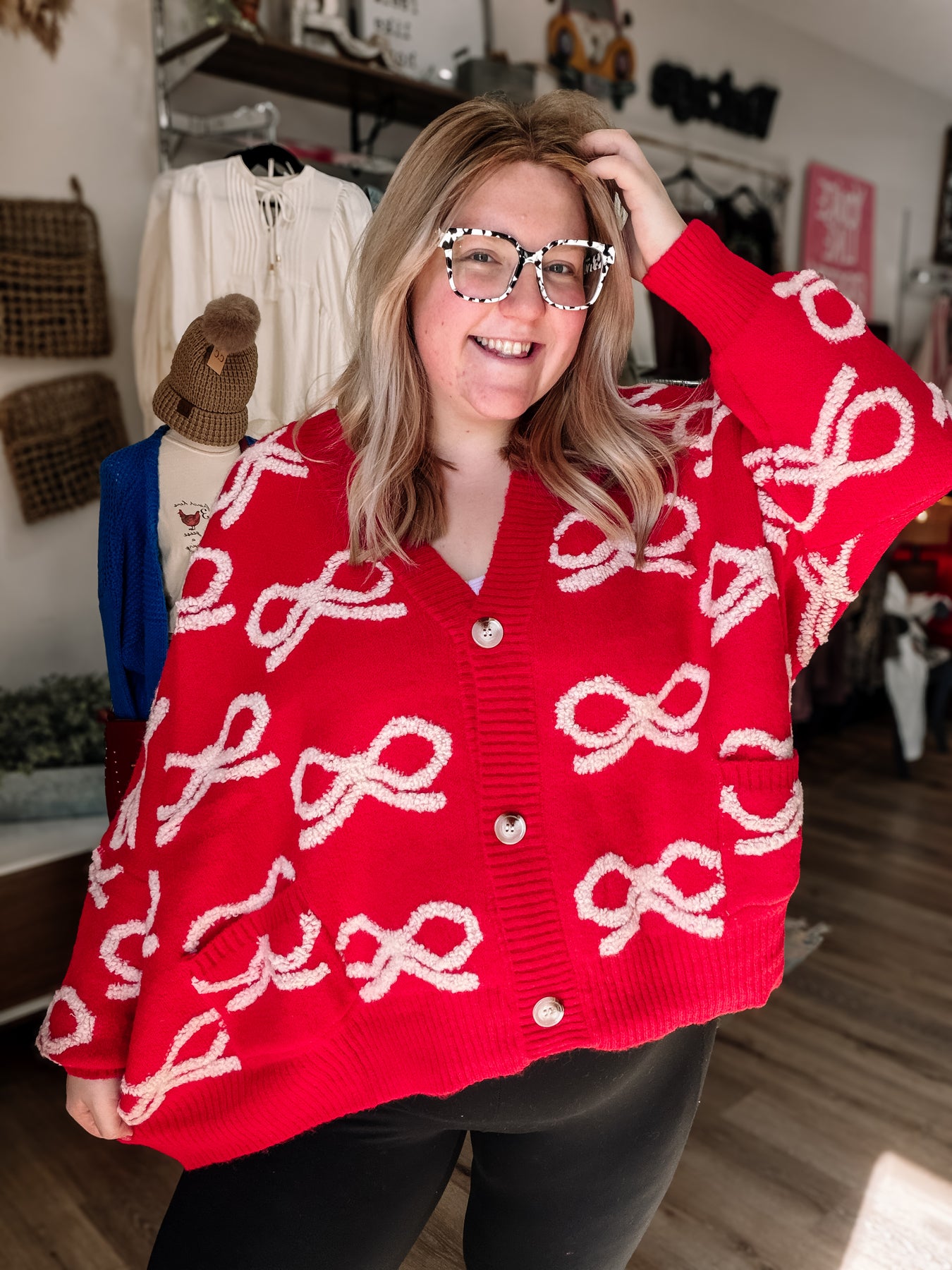 Super oversized, soft and comfortable bow cardigan! Kendall is in a large and it fits perfectly. She could have easily done the medium, too.
